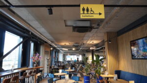 Voorafgaande aan het werk is er een geluidsmeting gedaan. De receptie is van 1,48 seconden naar 0,74 seconden gegaan: hiermee voldoet het ruimschoots aan de eisen uit de BREEAM normering. De werkplaats is van 2,06 naar 1,12 seconden gegaan. Als we het volume van deze ruimte naast het NOC*NSF beleid houden voldoet ook deze ruimte aan de normering. Voor werkplaatsen is geen eenduidige normering, vandaar het vergelijk met sporthallen. Deze worden ook gecorrigeerd naar gelang de inhoud van de ruimte groter wordt.