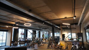 De showroom is een veelzijdige ruimte. Het is de ontvangstruimte voor de werkplaats, de showroom voor het fietspunt en kent een horecafunctie. Hier is een houten rachelwerk geplaatst met de OWA RAW panelen in betonlook. Het zorgt voor een geheel met de bestaande uitstraling.